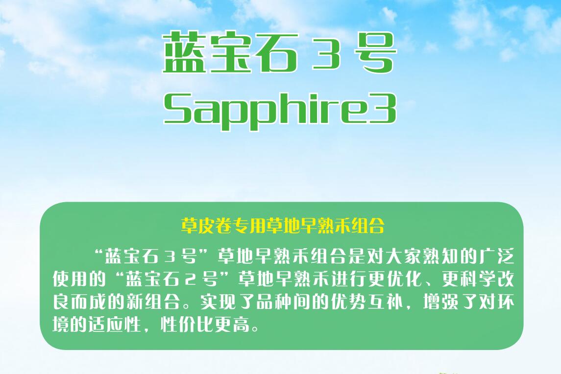 “蓝宝石3号”适宜春、秋季节播种,当地温高于16℃时 播种最好,播种量以15-20g/m2为宜。播种前需清除杂草与杂物,便于土地的耕翻与平整,也便于消灭多年生杂草。为了使草坪保持优良的质量,土层厚度最好不小于30cm。平整后撒施基肥,然后普遍进行一次耕翻。选择无风或微风天气播种,保证播量准确,播撒均匀。播种后,覆土深度不应超过0.5cm;之后用50-80kg滚筒进行镇压,确保草种与土壤接触紧密,防止后期吊苗。播后24小时内进行第一次喷灌,喷湿土壤5-10cm,保证坪床湿润,直至种子发芽至苗齐;后期少次足量的灌溉有利于根系的生长发育,也有利于抗旱耐热。当草坪生长至6-8cm时,对草坪进行第一次修剪,选用悬刀式剪草机,修剪按照修剪1/3,保留2/3的原则进行。苗期应注意控制杂草,苗期进行3-5次杂草防除工作,采用化学防治与人工拔除相结合。做好苗期病虫害防治工作,如幼苗凋萎病、根腐病及食叶、食茎害虫的发生。日常管理中要注意合理修剪、施肥和灌溉,尽可能降低人为因素对草坪的不利影响。