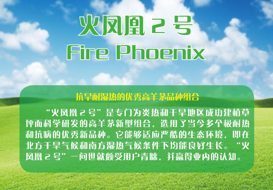 “火凤凰”对土壤的适应性强,需肥量中等。“火凤凰”适宜春、秋季节播种,当地温高于16℃时 播种最好,播种量以30-45g/m2为宜。播种前需清除杂草与杂物,便于土地的耕翻与平整,也便于消灭多年生杂草。为了使草坪保持优良的质量,土层厚度最好不小于30cm。平整后撒施基肥,然后普遍进行一次耕翻。选择无风或微风天气播种,保证播量准确,播撒均匀。播种后,覆土深度不应超过0.5cm;之后用50-80kg滚筒进行镇压,确保草种与土壤接触紧密,防止后期吊苗。播后24小时内进行第一次喷灌,喷湿土壤5-10cm,保证坪床湿润,直至种子发芽至苗齐;后期少次足量的灌溉有利于根系的生长发育,也有利于抗旱耐热。当草坪生长至8-10cm时,对草坪进行第一次修剪,选用悬刀式剪草机,修剪按照修剪1/3,保留2/3的原则进行。苗期应注意控制杂草,苗期进行3-5次杂草防除工作,采用化学防治与人工拔除相结合。做好苗期病虫害防治工作,如幼苗凋萎病、根腐病及食叶、食茎害虫的发生。日常管理中要注意合理修剪、施肥和灌溉,尽可能降低人为因素对草坪的不利影响。