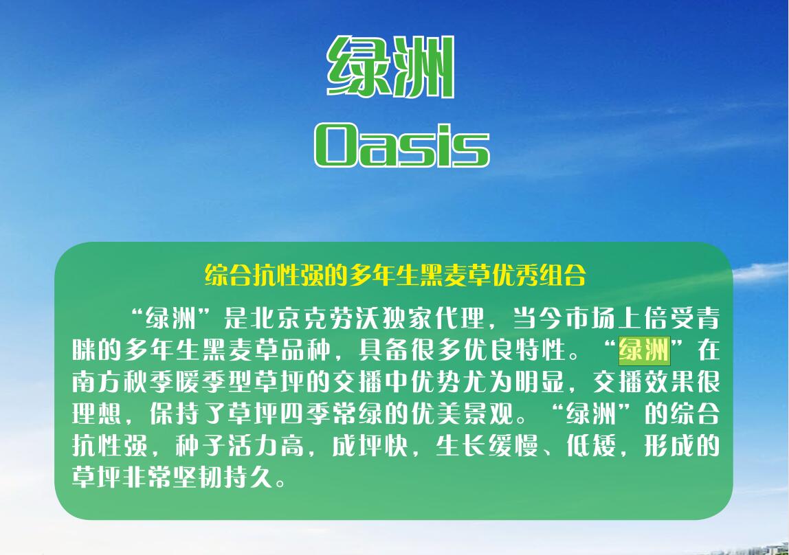 “绿洲”极强的抗逆性使之具有广泛的适应性,适宜于各类草坪建植及补播。常用于高尔夫球场、运动场、广场、公园、庭院、草皮卷生产、城镇绿化和南方秋季补播。